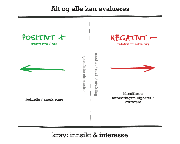 Med mellomrom trenger de fleste gode og presise tilbakemeldinger for å stimulere egen utvikling. Når vi gir tilbakemeldinger så bygger disse direkte eller indirekte på evalueringer vi har gjort oss. Derfor er det grunnleggende viktig at evalueringen dreier seg om vesentlige forhold og at den er åpen. Så er det viktig at vi behersker noen teknikker eller verktøy som gjør tilbakemeldingen tydelig og forståelig slik at den kan påvirke atferden til mottaker i riktig retning